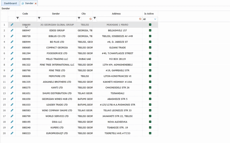 To edit sender information the Edit button is displayed next to each row. By clicking the Edit button the form opens and we can change the necessary information. After making changes click the Save button and the data will be updated.