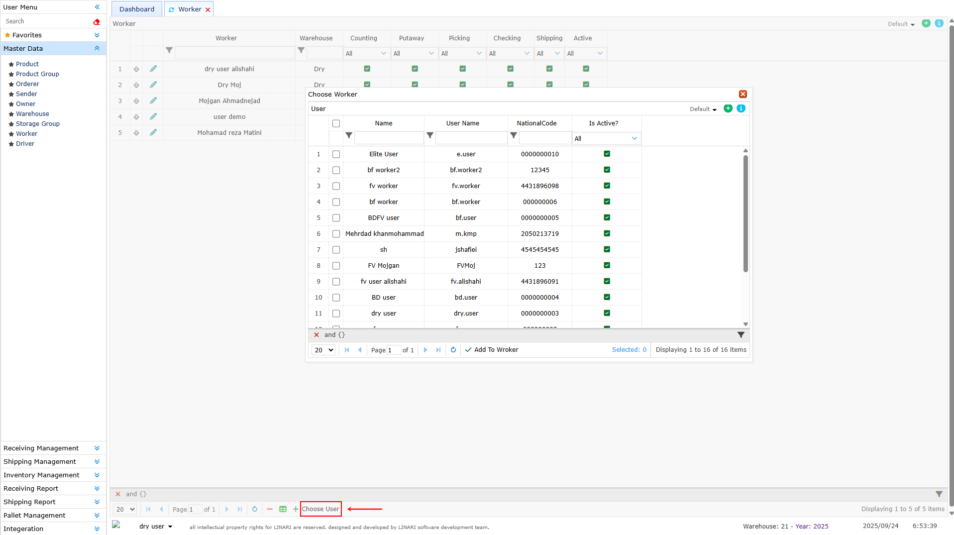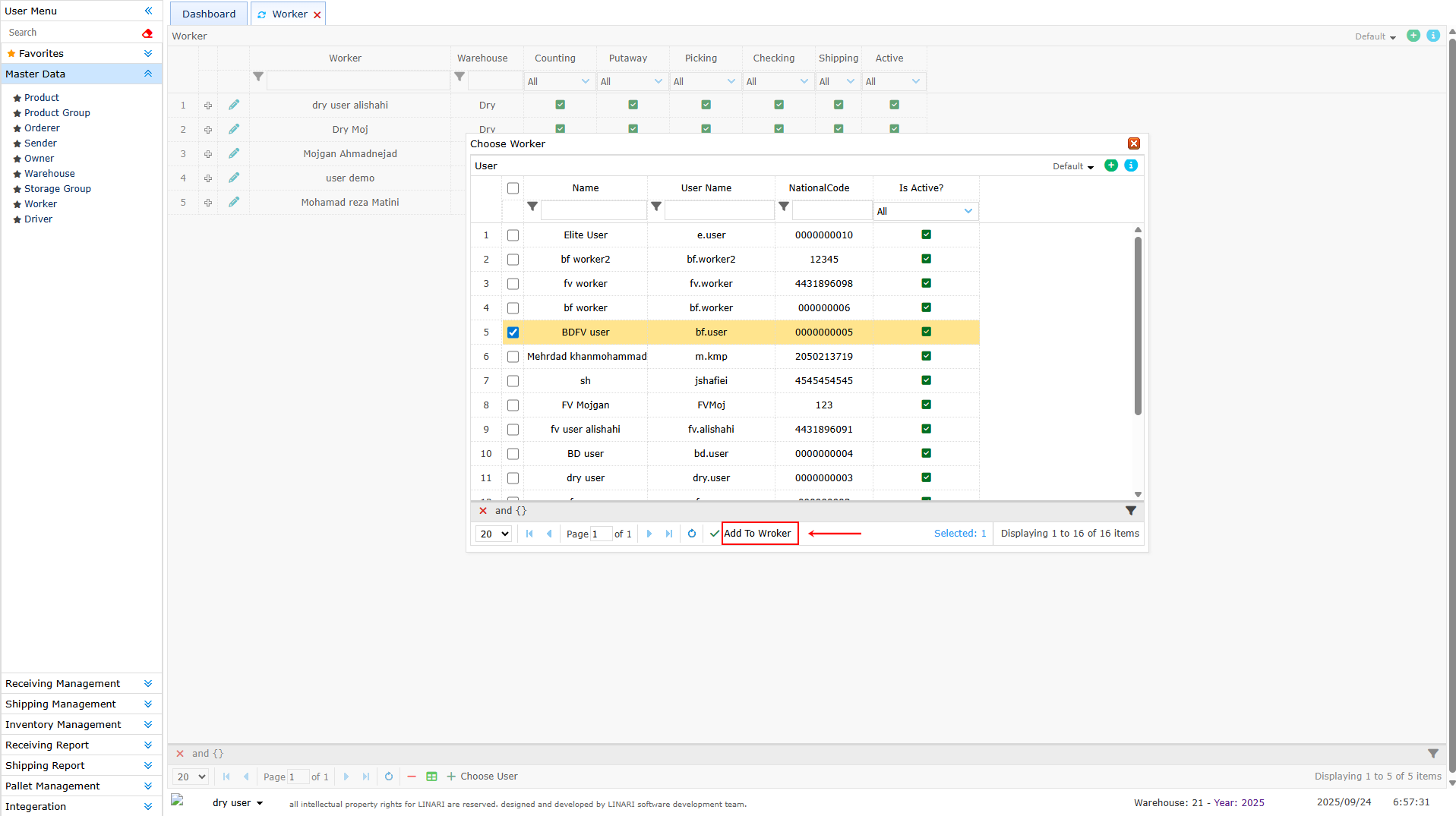 By clicking on one of the users we select it and then click the Add To Worker button. In this way the new warehouse keeper is added to this warehouse and is visible in the list of warehouse keepers.