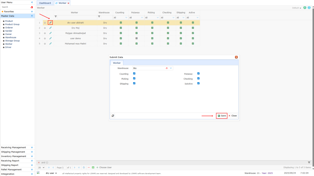 On the opened page in the Warehouse section select and register the desired warehouse then fill in the rest of the information according to the warehouse keeper’s access rights and finally click the Save button.