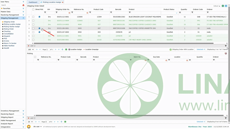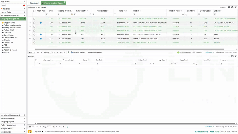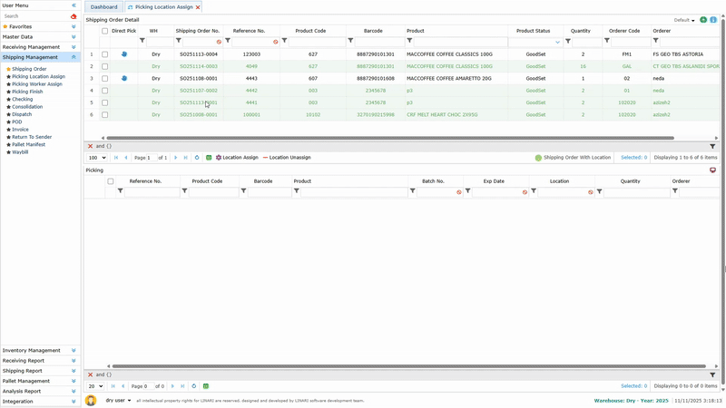 2. The confirmed items are displayed on the Picking Location Assign page, and it is possible to assign locations for them.