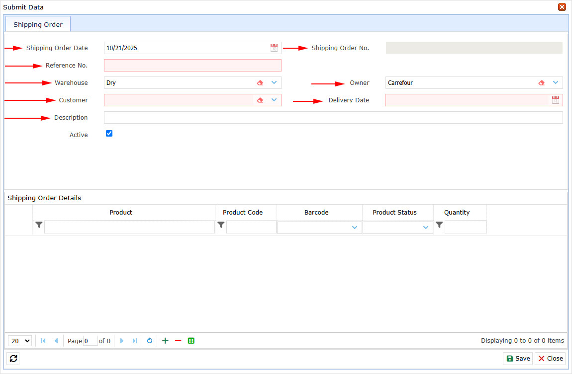 To send goods to an Orderer, you must first create a Shipping Order. A shipping order contains complete information about the items to be shipped.