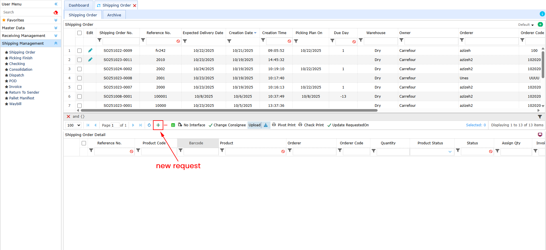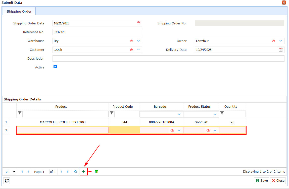 7. Finally, click Save. The shipping order will be created and displayed in the main request list.