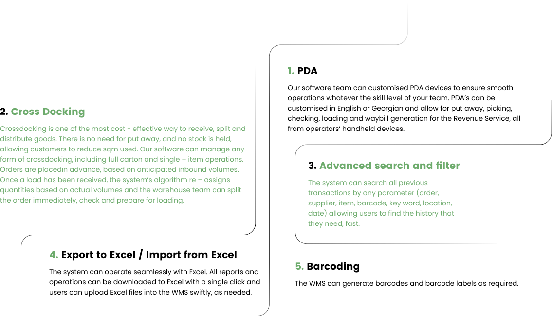 Our software team can customise PDA devices to ensure smooth operations whatever the skill level of your team. PDA’s can be customised in English or Georgian and allow for put away, picking, checking, loading and waybill generation for the Revenue Service, all from operators’ handheld devices.